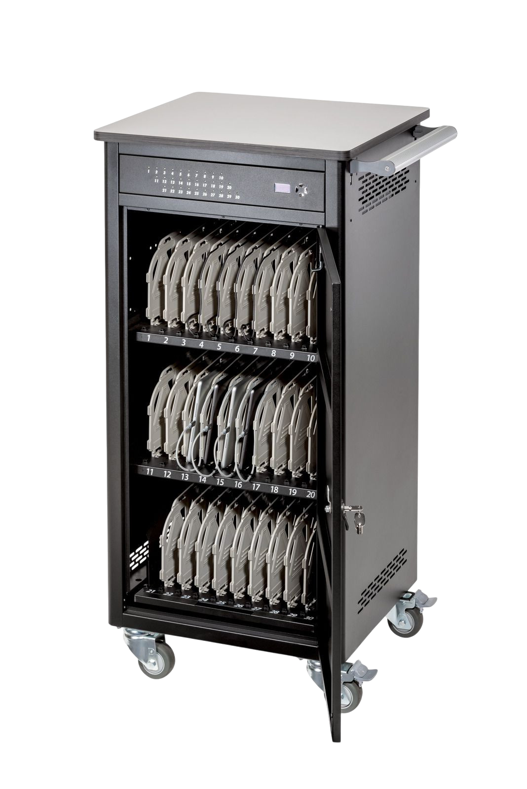 Découvrez notre gamme exclusive de chariots et trolleys, parfaitement conçus pour transporter et charger efficacement vos flottes de tablettes et d’ordinateurs portables. Sécurité et mobilité optimales pour tous vos besoins éducatifs et professionnels.